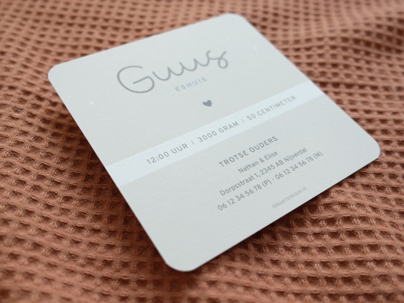 Is jullie kindje geboren? Jullie geven mij alle gegevens door, ik stuur vervolgens het ingevulde digitale ontwerp. Als jullie hier akkoord op geven gaan de kaarten in productie. De levertijd is afhankelijk van de kaart en afwerking deze bedraagt hooguit 4-5 werkdagen. Je pakket wordt verzonden en je ontvangt hiervan een track en trace code.