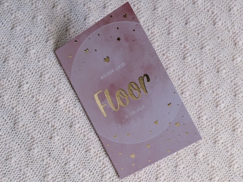 Welkom lieve Floor! 💖 Een super shiny geboortekaartje waar lekker veel foliedruk op verwerkt is! ✨ Wat vind jij van het resultaat?