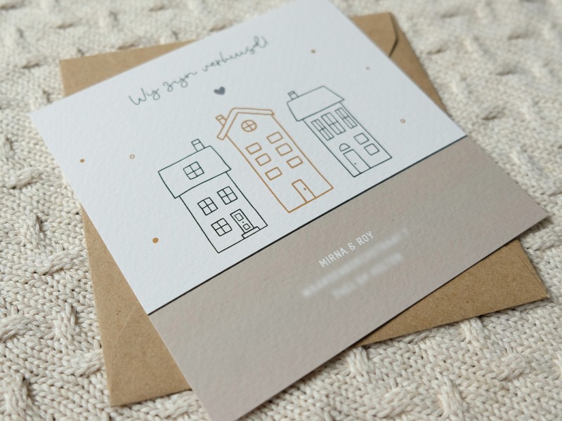 Voor Mirna & Roy mocht ik deze verhuiskaart maken. Hoe leuk is het om te laten weten dat je verhuisd bent door middel van een unieke verhuiskaart?