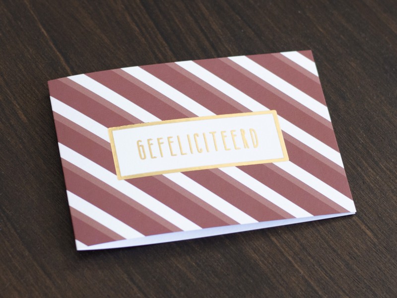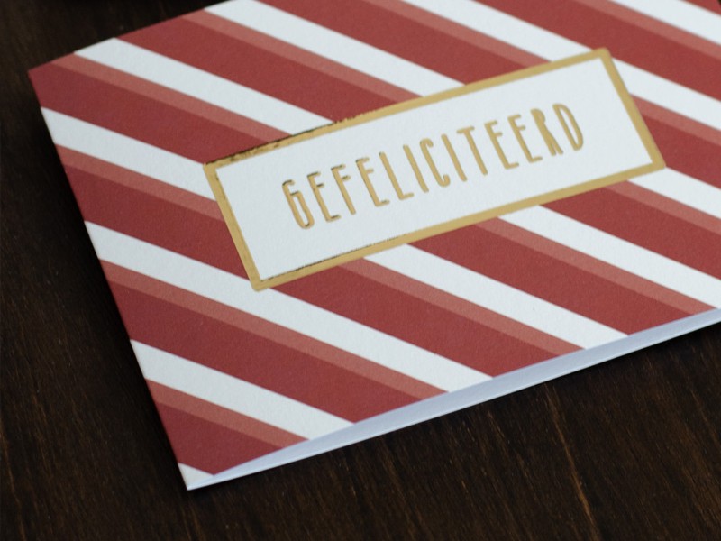Dit kaartje is geprint op 300 grams gestreken karton met luxe reliëf afgewerkt met goudfolie druk.