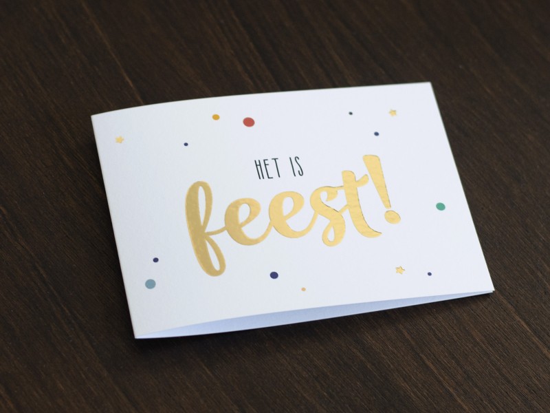 Dit kaartje is geprint op 300 grams gestreken karton met luxe reliëf afgewerkt met goudfolie druk.