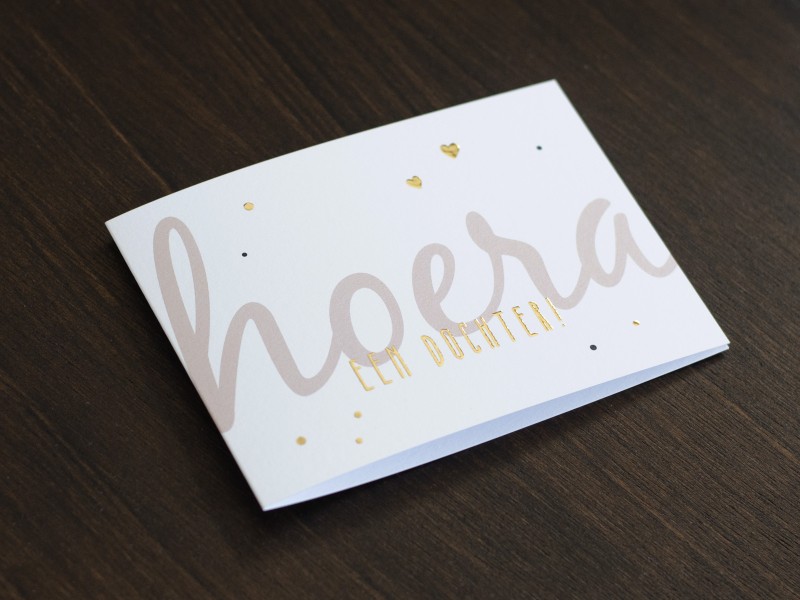 Dit kaartje is geprint op 300 grams gestreken karton met luxe reliëf afgewerkt met goudfolie druk.