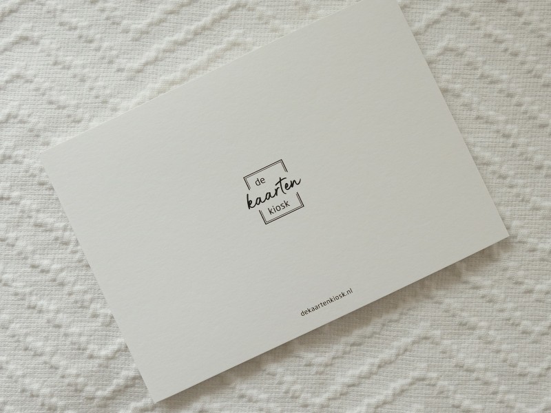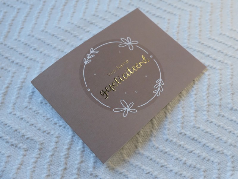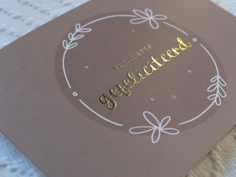 Dit kaartje is geprint op 300 grams gestreken karton met luxe reliëf afgewerkt met goudfolie druk.