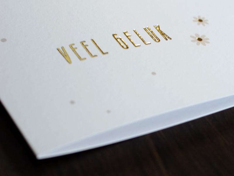 Dit kaartje is geprint op 300 grams gestreken karton met luxe reliëf afgewerkt met goudfolie druk.