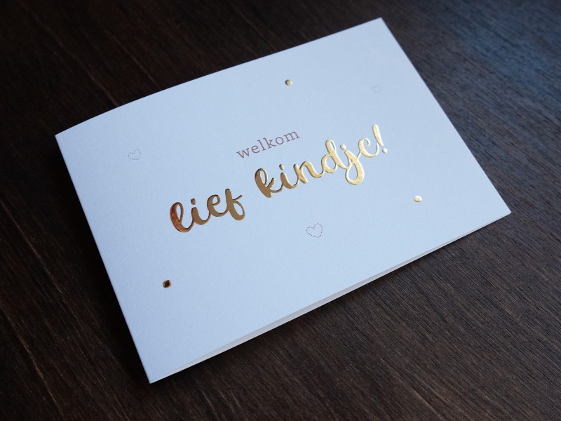 Dit kaartje is geprint op 300 grams gestreken karton met luxe reliëf afgewerkt met goudfolie druk.