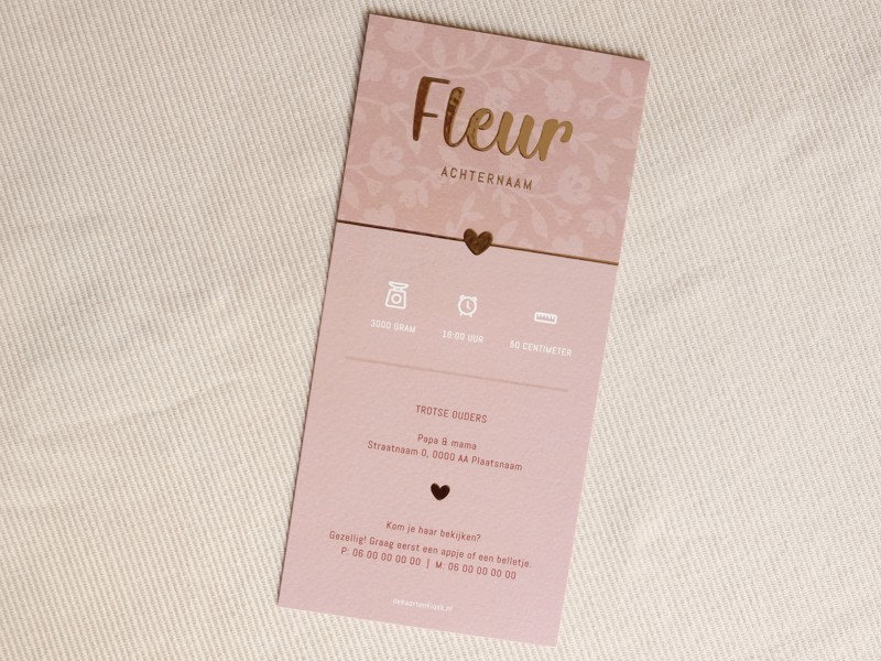 Is jullie kindje geboren? Jullie geven mij alle gegevens door, ik stuur vervolgens het ingevulde digitale ontwerp. Als jullie hier akkoord op geven gaan de kaarten in productie. De levertijd is afhankelijk van de kaart en afwerking deze bedraagt hooguit 4-5 werkdagen. Je pakket wordt verzonden en je ontvangt hiervan een track en trace code.