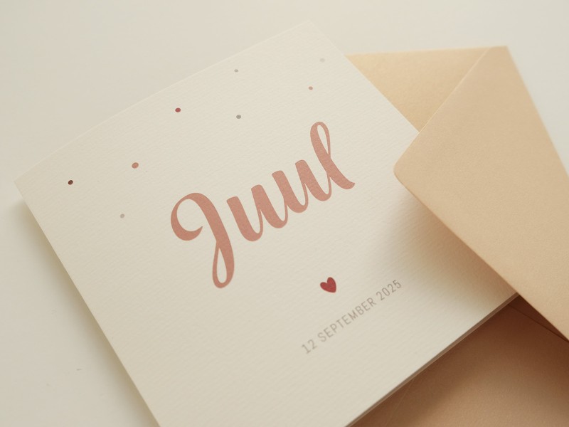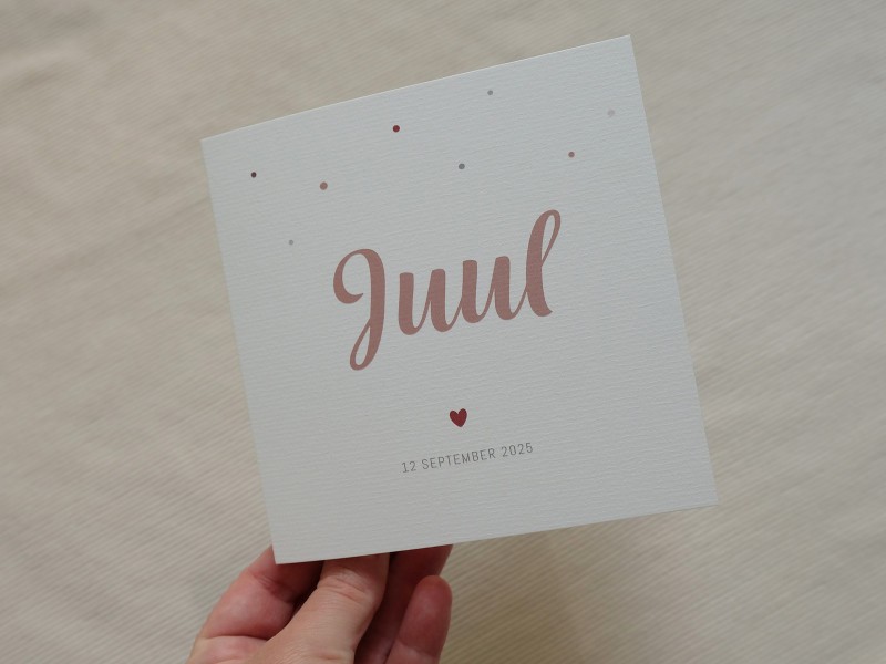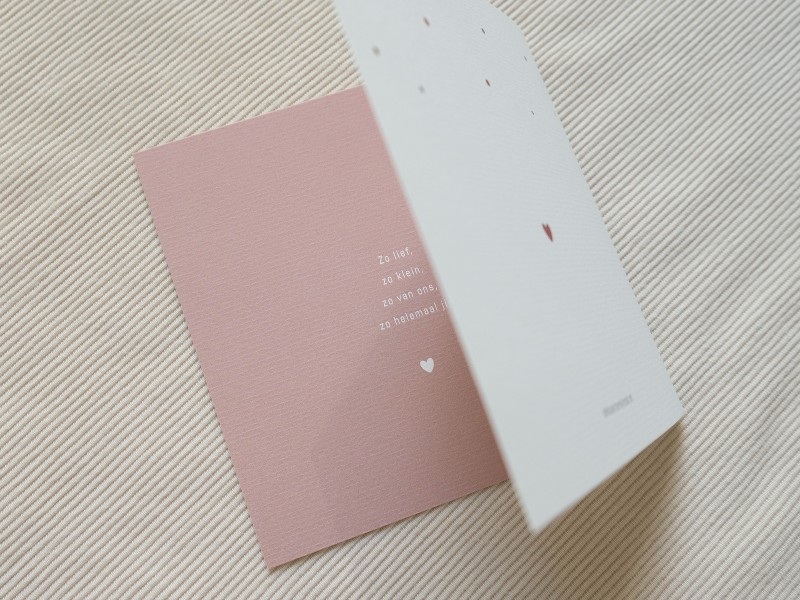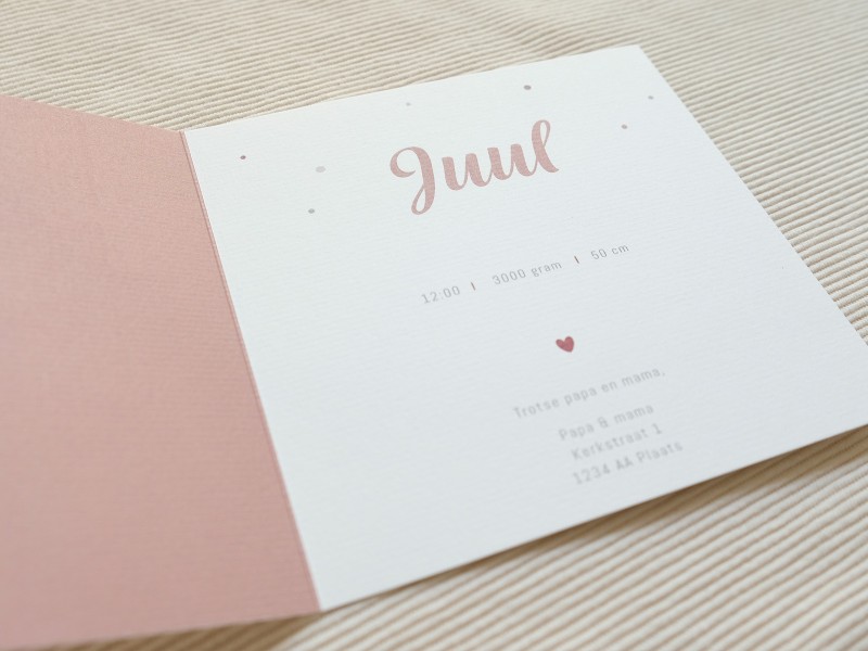 Een lief geboortekaartje. Deze gevouwen kaart is gedrukt op ongestreken karton. De roze tint van de naam komt aan de binnenkant terug.