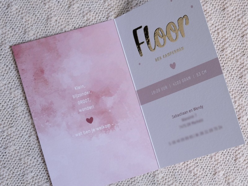 Welkom lieve Floor! 💖 Een super shiny geboortekaartje waar lekker veel foliedruk op verwerkt is! ✨ Wat vind jij van het resultaat?