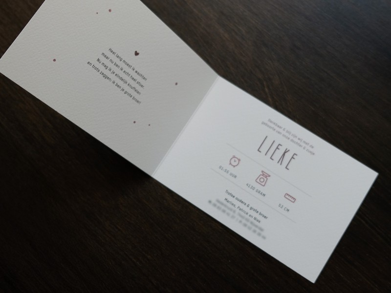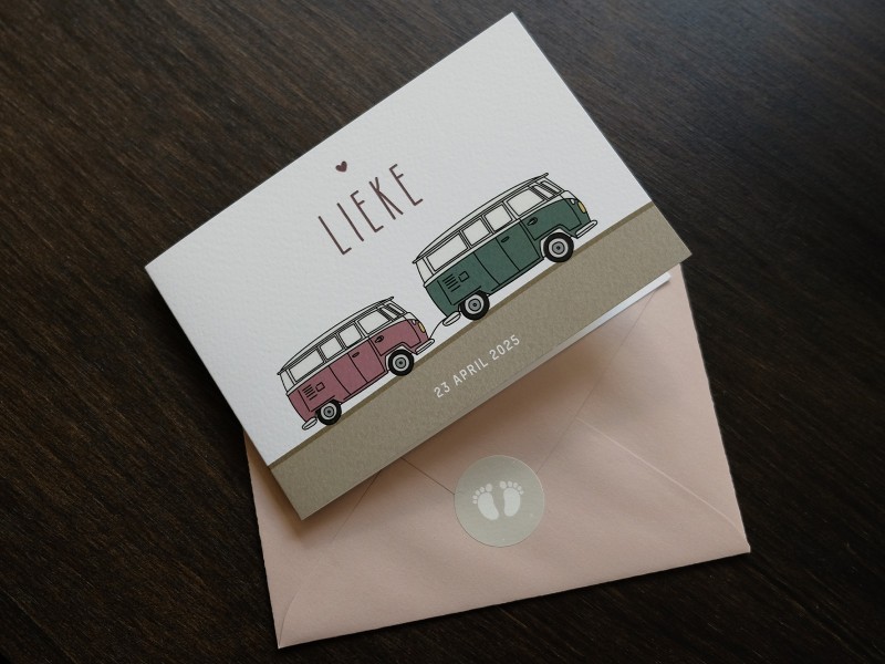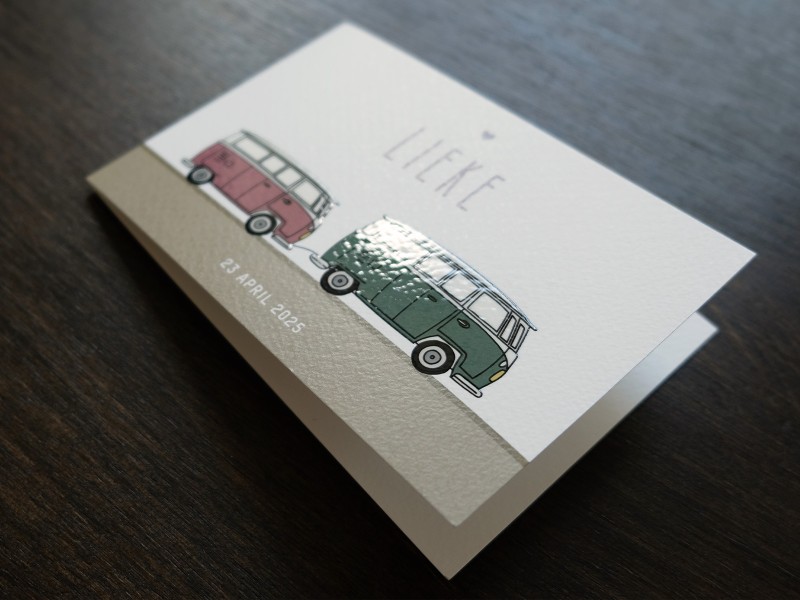 Jaaa Lieke is geboren! Dit super persoonlijke geboortekaartje mocht ik maken voor Marlies & Patrick. Voor de grote broer van Lieke heb ik ook een geboortekaartje mogen maken met een Volkswagen busje dus kon dit busje natuurlijk niet achter blijven op haar kaart. Om het busje er nog meer uit de kaart te laten springen is het afgewerkt met spot-uv lak (het glimmende laagje).