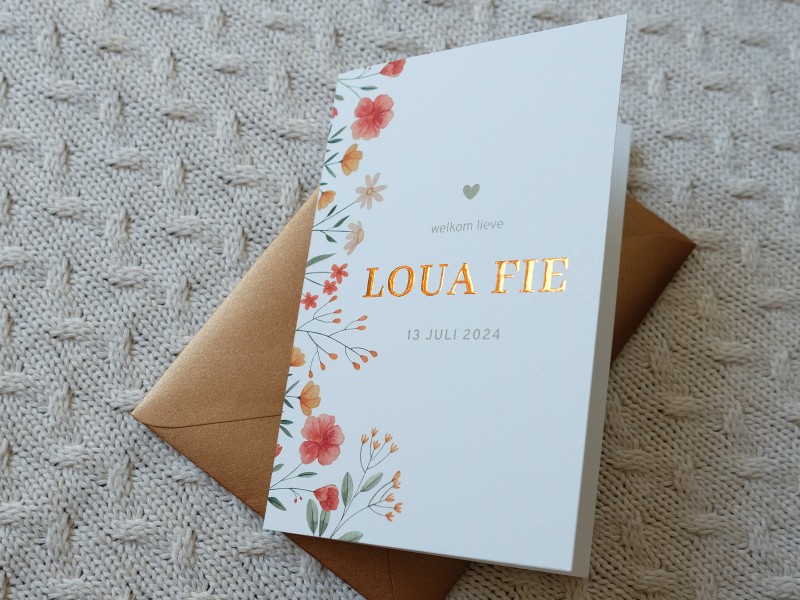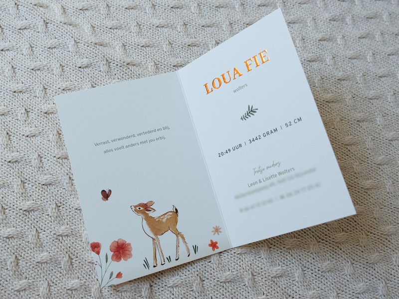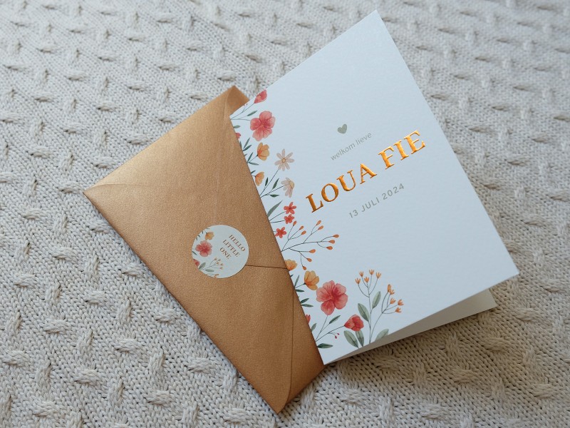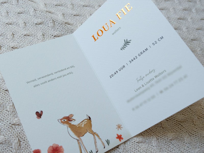 Is jullie kindje geboren? Jullie geven mij alle gegevens door, ik stuur vervolgens het ingevulde digitale ontwerp. Als jullie hier akkoord op geven gaan de kaarten in productie. De levertijd is afhankelijk van de kaart en afwerking deze bedraagt hooguit 4-5 werkdagen. Je pakket wordt verzonden en je ontvangt hiervan een track en trace code.