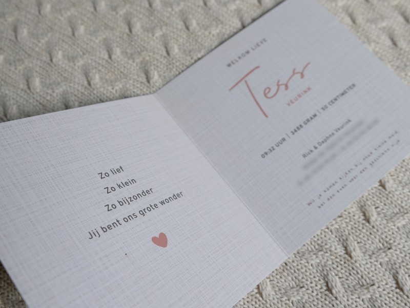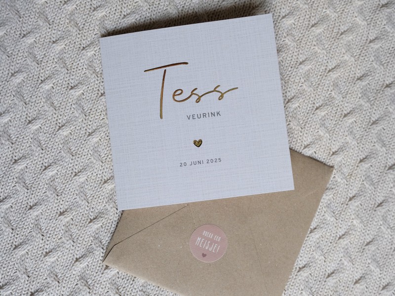 Jaaa Tess is geboren! De ouders van Tess wilde graag een "linnen look" geboortekaart. Deze kaart is afgewerkt met goud foliedruk. De envelop is dichtgeplakt met een leuke, bijpassende sluitsticker!