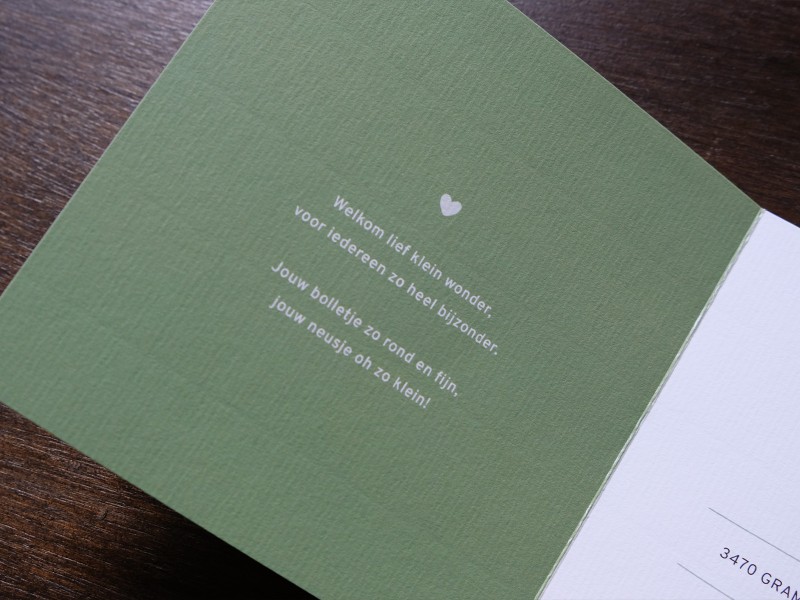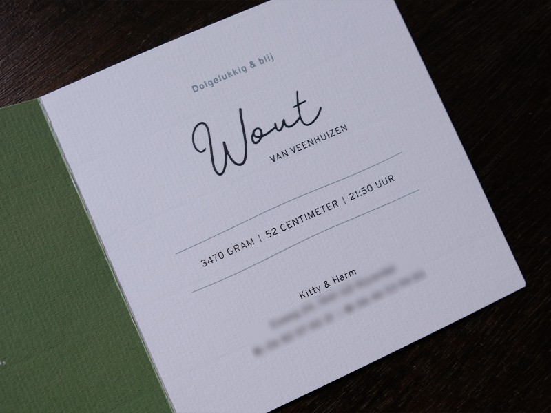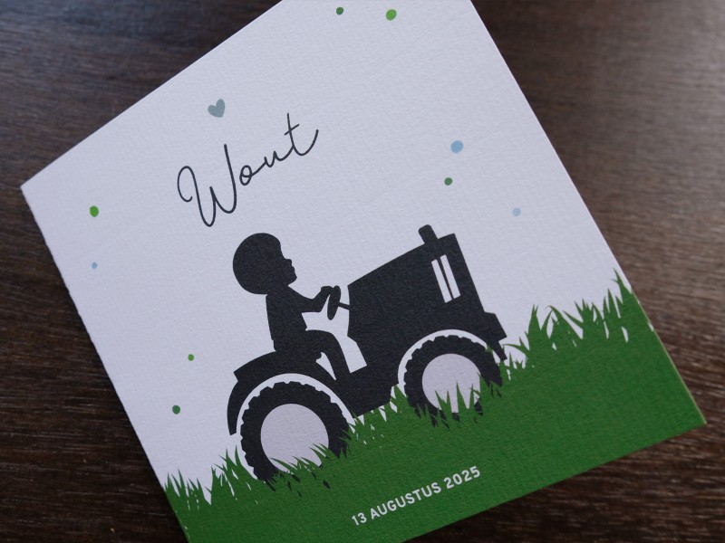 Wout is geboren! Het geslacht van de baby was een verrassing maar in het geval van een jongetje wilde de ouders van Wout graag een kaart met een trekker. Het geboortekaartje is gedrukt op een papiersoort met viltmarkering. Dit zorgt voor de mooie lijnenstructuur op beide kanten van het papier en geeft een klassieke uitstraling.