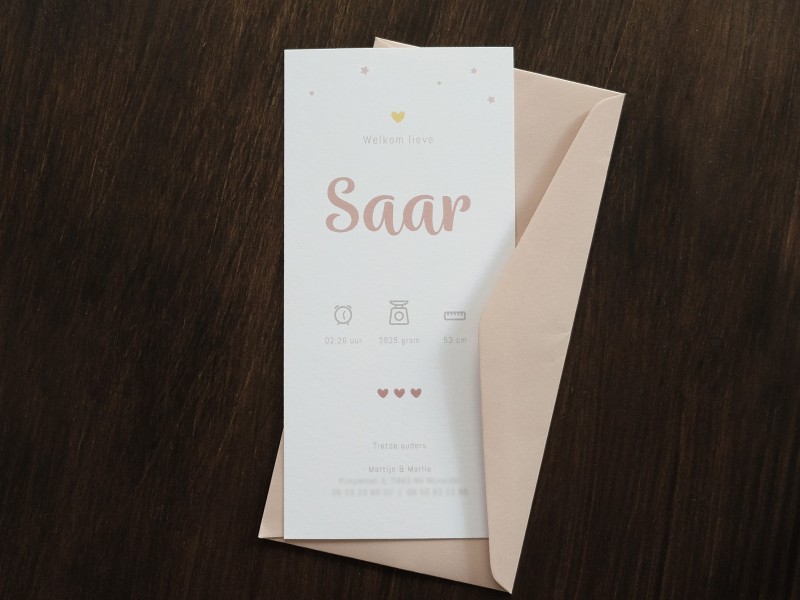 Is jullie kindje geboren? Jullie geven mij alle gegevens door, ik stuur vervolgens het ingevulde digitale ontwerp. Als jullie hier akkoord op geven gaan de kaarten in productie. De levertijd is afhankelijk van de kaart en afwerking deze bedraagt hooguit 4-5 werkdagen. Je pakket wordt verzonden en je ontvangt hiervan een track en trace code.