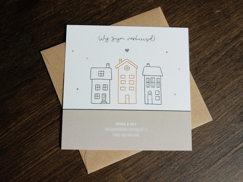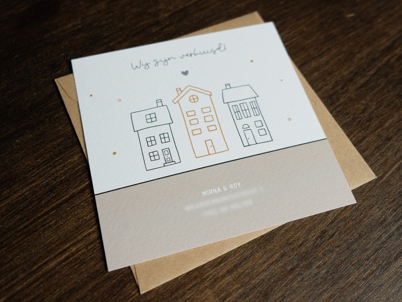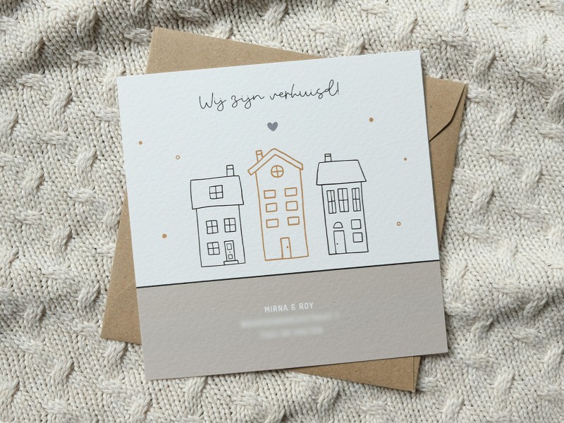 Voor Mirna & Roy mocht ik deze verhuiskaart maken. Hoe leuk is het om te laten weten dat je verhuisd bent door middel van een unieke verhuiskaart?