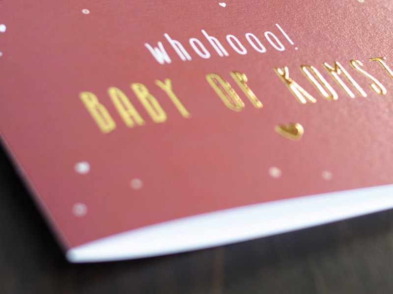 Dit kaartje is geprint op 300 grams gestreken karton met luxe reliëf afgewerkt met goudfolie druk.