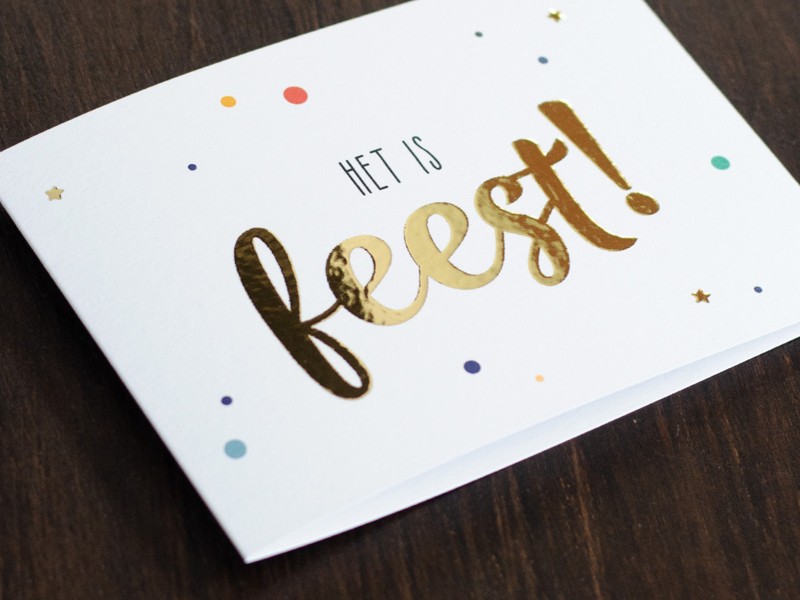 Dit kaartje is geprint op 300 grams gestreken karton met luxe reliëf afgewerkt met goudfolie druk.