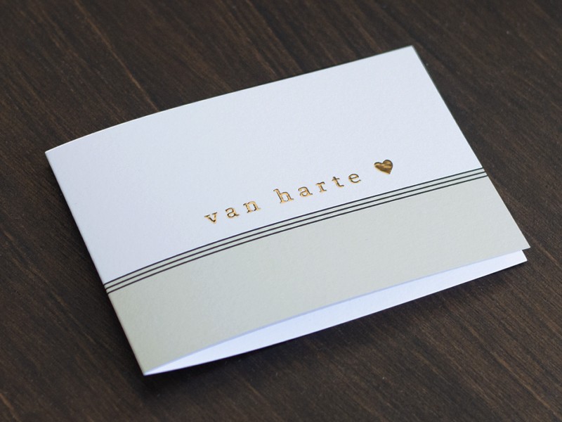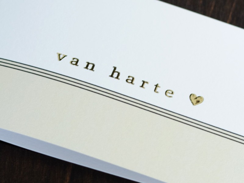 Dit kaartje is geprint op 300 grams gestreken karton met luxe reliëf afgewerkt met goudfolie druk.